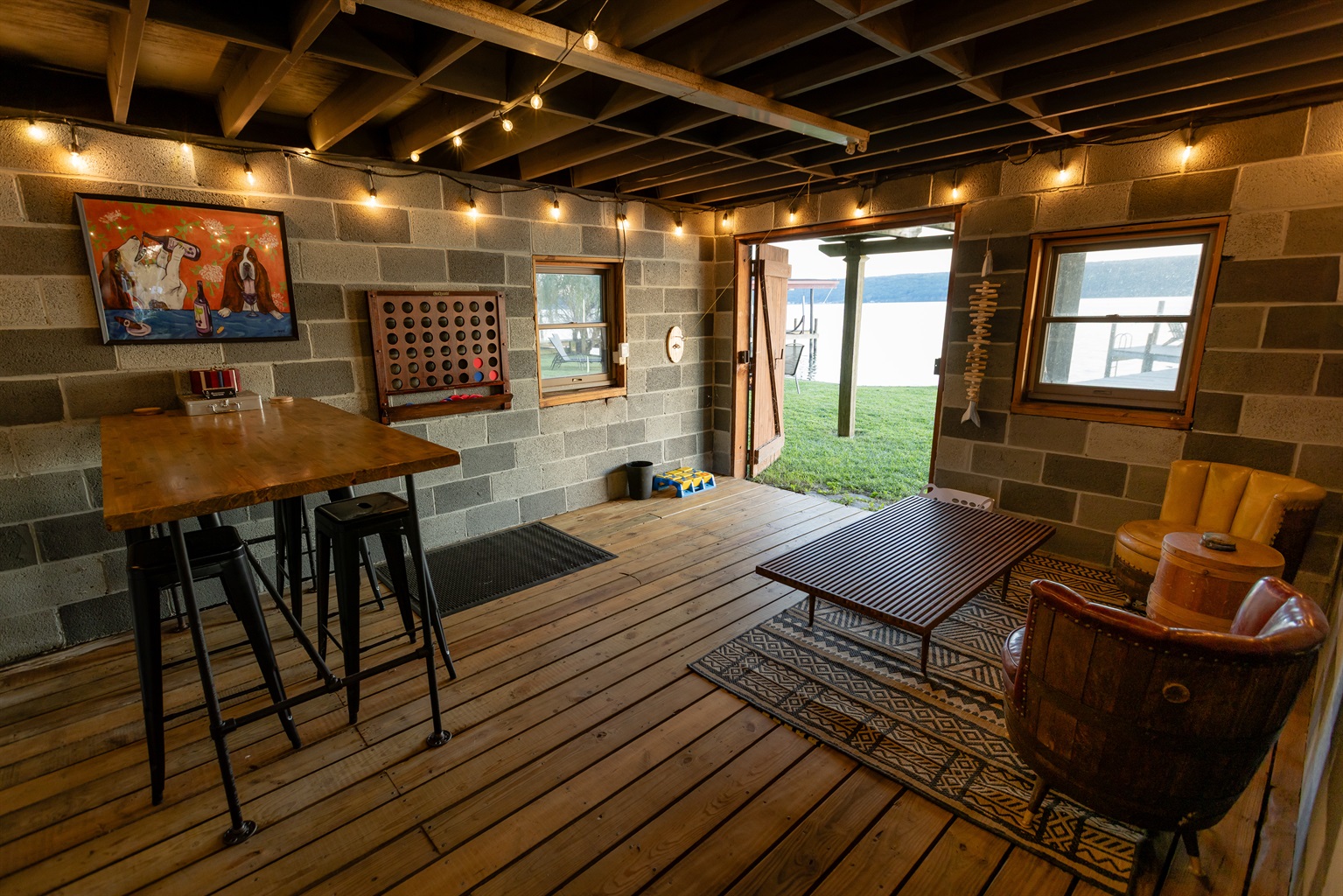 Take the stairs down to the water where you will find the boathouse with a cozy sleeping area. Fall asleep to the sound of waves in the queen bed with a clear view of the water or enjoy your morning cup of coffee at the bistro table on the deck. Located on the first floor of the boathouse is the rustic bar area with mini fridge, darts, and parlor games. There is no bathroom in the boathouse. (Please note there are 2 full flights of stairs to get to the water and no bathroom).